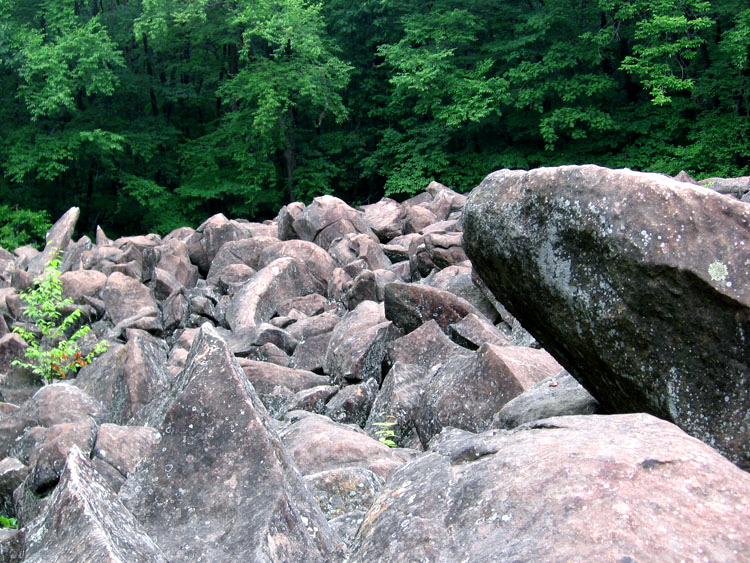 Forewarned of their impending arrival, I reviewed my folder of pre-Internet information on ringing boulder fields. Their geological history began approximately 200 million years ago in the early Jurassic Age. Ancient Lake Lockatong had covered most of Bucks County and then had gradually filled with sediments that had hardened into shale. Molten rock within the earth was forced into the shale and hardened into a ledge of olivine diabase rock, sandwiched within the shale. But over the eons, the shale’s upper layer eroded and exposed the diabase. Subsequent severe freezing during the last Ice Age, when glaciers came close to but did not reach Bucks County, causing so-called periglacial conditions, broke the diabase into boulders.
