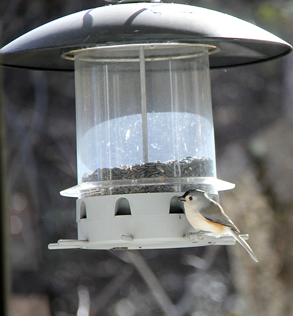 Tufted titmice and northern cardinals weren’t residents in central Maine in the 1960s as they are now, so I was pleasantly surprised when they appeared at our Pennsylvania feeder. And not so pleasantly surprised when gray squirrels raided it. In Maine, gray squirrels rarely appeared and the more common red squirrels stayed in the pine forest. After struggling to keep the squirrels from our open, wooden feeder in Pennsylvania, I replaced it with a couple tube feeders, which they have not had much success invading.