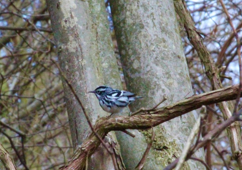 That same day I made a stop at Coyote Bench on the Far Field Road. I watched what looked like a young black-and-white warbler foraging in the trees. Then there was scolding behind me as a male black-and-white warbler appeared with food in his beak. He came close enough that I could see that he had a caterpillar. He flew from branch to grapevine back and forth and then flew off. Next, a female black-and-white flew in with food in her beak. She was not as brightly-colored as the male, but not as dull-colored as the first bird I saw. From this I assumed the black-and-white warblers had been feeding at least one fledgling and possibly more hidden in the tangle of shrubs and vines in front of the bench.