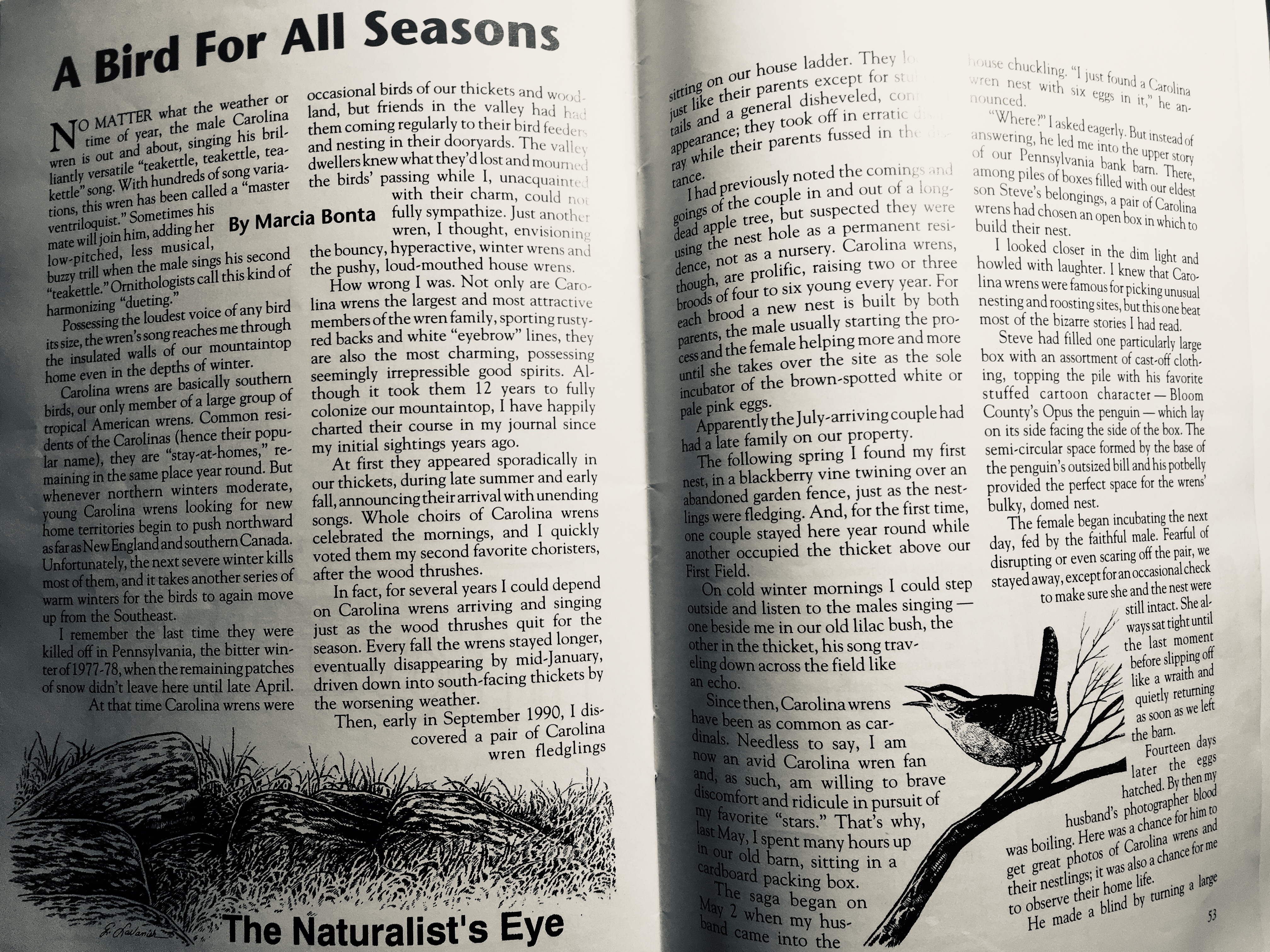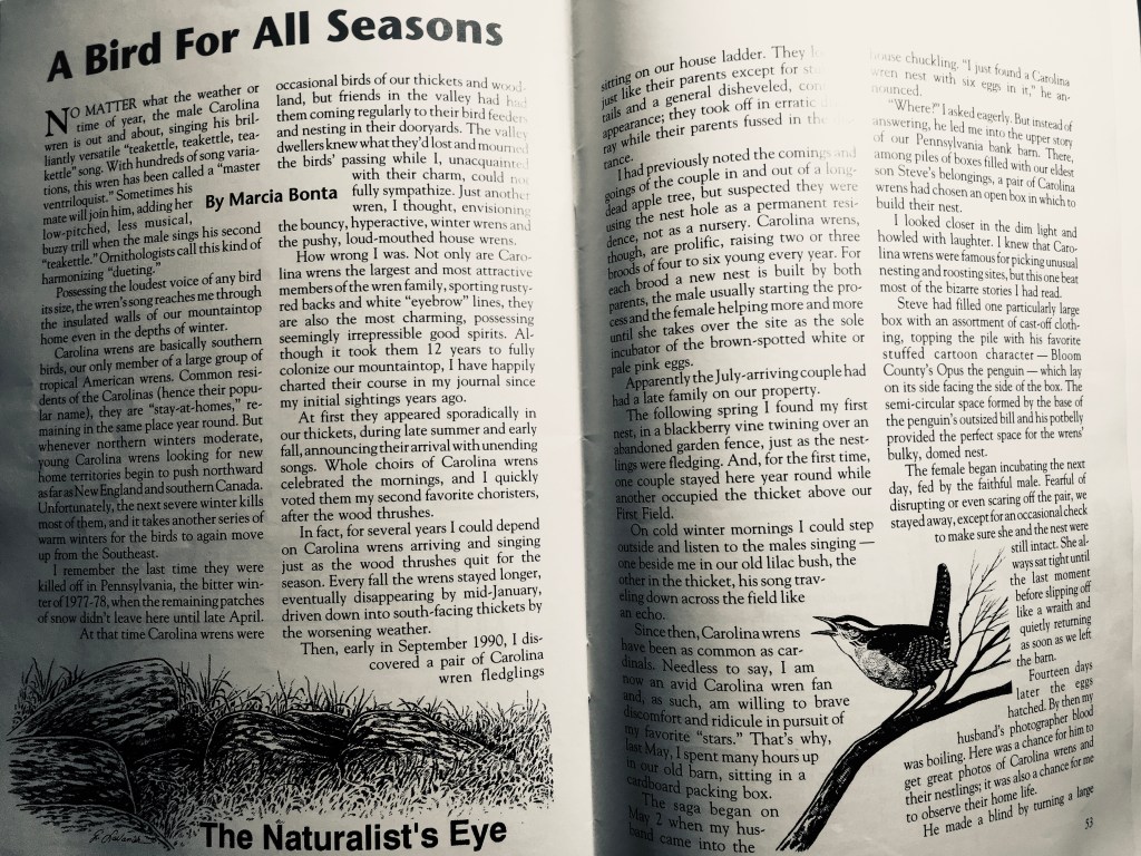 I began writing it in January 1993 and the subject was the Carolina wren, “A Bird for All Seasons.” The previous May, Bruce had come into our house and told me that he had just found a Carolina wren nest with six eggs in it. It was in the upper story of our Pennsylvania bank barn in a box of our son, Steve’s cast-off clothing that he had topped with his stuffed Opus the Penguin from his favorite Bloom County comic strip. The penguin was lying on its side and the bulky, domed wren nest had been constructed in the semi-circular space formed by the base of the penguin’s outsized bill and his potbelly.